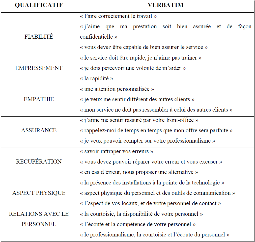 Il est important de préciser ici que ces différentes dimensions ou caractéristiques du service (qualité de service) seront énumérées par les clients à travers le guide d’entretien (Annexe 1) qui a permis de concevoir le questionnaire.