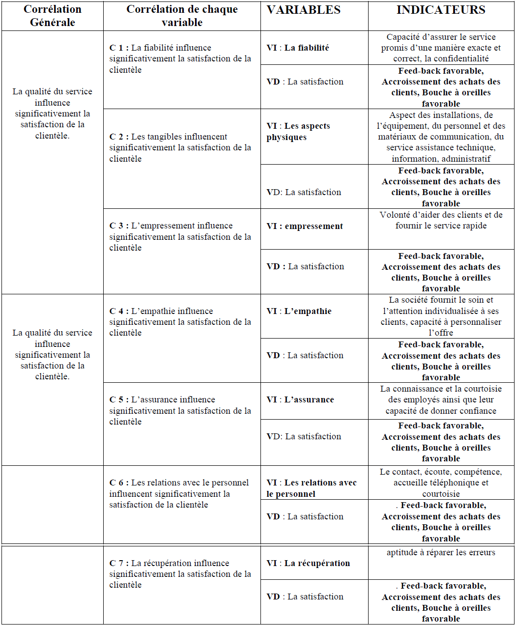 La variable explicative : c’est la cause du phénomène à expliquer. C’est celle qui est manipulée à volonté et qui explique la réponse, ici c’est « la qualité du service », dans notre étude cette variable se décline en 6 autres variables (la fiabilité, l’assurance, l’empressement, l’empathie, les aspects physiques et la récupération).