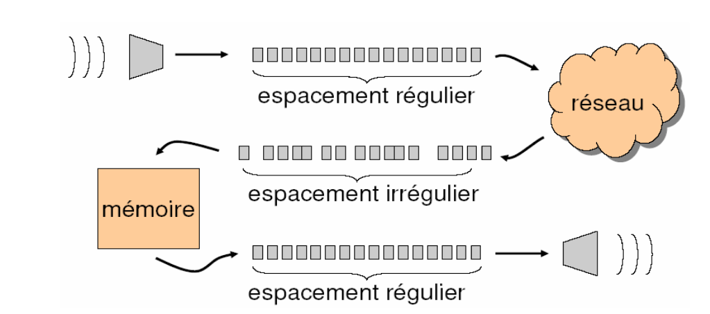 Ceci est proposé par le protocole RTCP qui fonctionne au dessus de RTP. Ayant une idée sur le débit réseau courant, le serveur peut estimer, sachant la taille des paquets à transmettre le temps qu’ils mettront.
