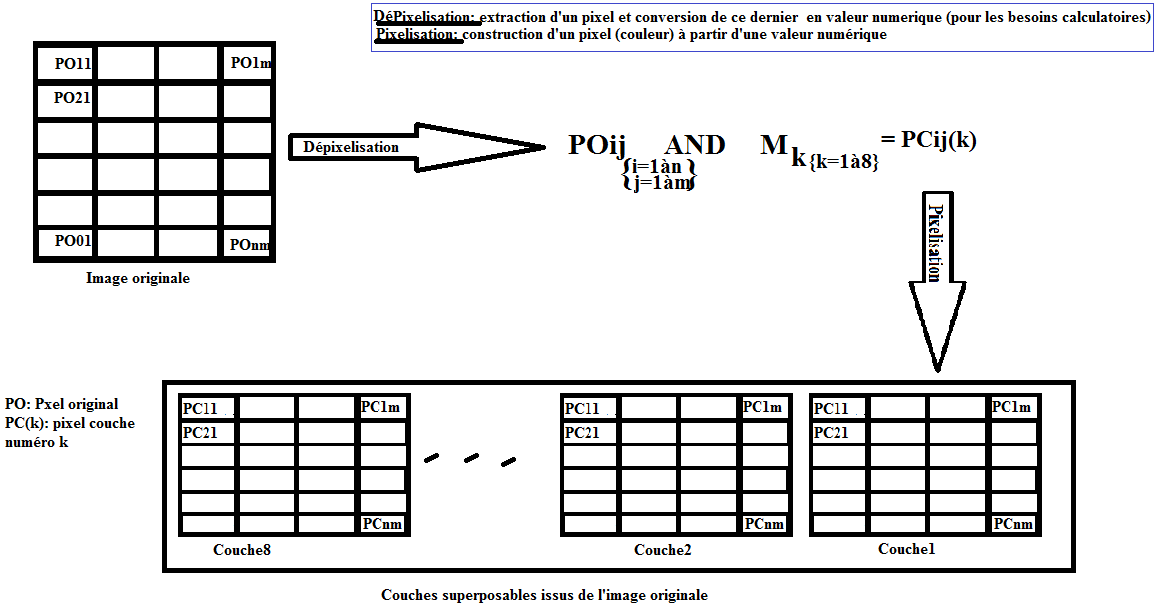 Pour chaque composante, on considère juste un certain nombre de bits sur l’ensemble représentant sa valeur. Les bits ignorés sont remplacés par des zéros. Nous avons ainsi pu définir huit (8) couches par image, chaque couche i étant définie comme suit :