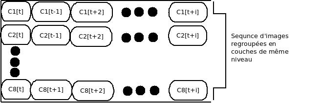 Le fichier vidéo est compilé dans un container à une piste vidéo. Cette piste contient une séquence d’images décomposées en couches superposables (1 à 8). Pour la manipulation du contenu vidéo par unité de temps correspondant à 1seconde, la vidéo est structurée en blocs d’images successives correspondant à une seconde de vidéo (25 images “couches” pour notre cas).