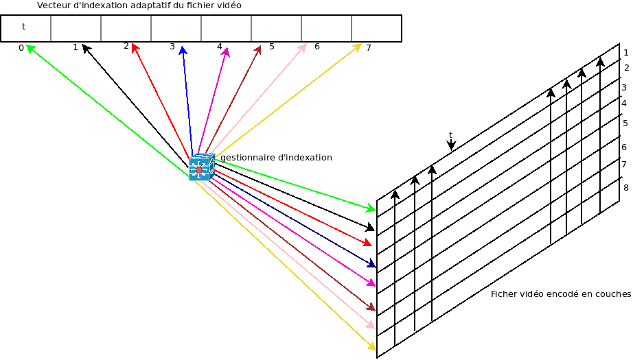 Un vecteur d’indexation adaptatif : Ce dernier est une structure de données contenant les temps (contenu de cellule) en fonction de la qualité (indice la cellule). Le couple (indice, contenu), constitue le point d’accès au fichier vidéo.