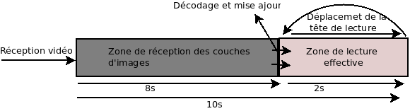 Dans ce système, le lecteur du client est chargé de lire les 2 secondes de vidéo se trouvant à l’extrémité droite du buffer. Pendant cette lecture, les couches non encore décompressées se trouvant dans la portion gauche du buffer (représenté par 8s dans le schéma 3.13) ,sont décodées (transformées en bitmap) et superposée si nécessaire. Ces couches superposées remplacent les images déjà lues dans la deuxième partie du buffer. Lorsque la tête de lecture arrive au bout de 2 secondes de vidéo, elle revient immédiatement en début de la zone des deux secondes pour lire la suite de la vidéo, celle-ci ayant été au préalable décodée depuis la zone de réception des couches et mise à jour dans la zone de lecture effective. Ceci nous donne un système de deux buffers communicant (la zone de réception met à jour la zone de lecture effective) et tournant (pour la zone de lecture effective).