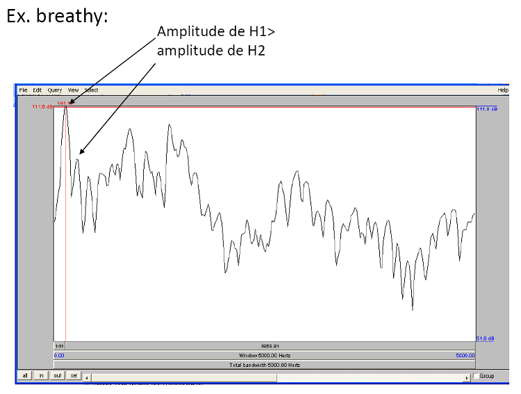 La voix des patients qui présentent une paralysie laryngée se caractérise par une voix soufflée. Ce type de phonation peut être évalué par Praat® par la différence, en amplitude, entre les deux premiers harmoniques. Par exemple une voix (breathy), l’amplitude de H1domine le spectre et est plus importante que l’amplitude de H2 et des harmoniques suivants : H1 et H2 sont à peu près d’égale amplitudes pour une voix normale.
