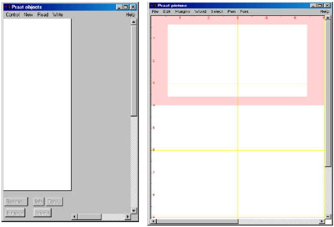 La fenêtre de gauche est la fenêtre « Praat objects ». Sur le côté gauche vous aurez normalement la liste de vos fichiers audio « ‘objets’ dans le langage PRAAT » qui peuvent ou bien avoir été entièrement créés, ou bien avoir été lus à partir d’un fichier. La fenêtre de droite est la fenêtre « Praat picture » qui est utilisée pour afficher les graphes. Ces derniers peuvent être enregistrés. Ou bien être imprimés directement par la commande « print » (CTRL-P) du