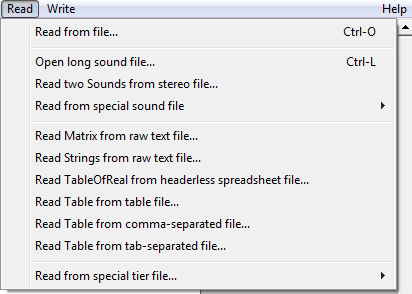 – Enfin, vous pouvez lire des fichiers provenant d’un disque « PRAAT lit de nombreux formats », y compris les fichiers longs appelés « long sound files ». Ces derniers sont des fichiers son pré-enregistrés et stockés sur le disque, dans lesquels le programme vous permet de sélectionner une petite portion du signal total pour l’analyser.