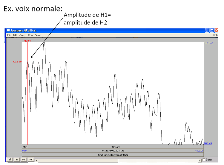 La voix des patients qui présentent une paralysie laryngée se caractérise par une voix soufflée. Ce type de phonation peut être évalué par Praat® par la différence, en amplitude, entre les deux premiers harmoniques. Par exemple une voix (breathy), l’amplitude de H1domine le spectre et est plus importante que l’amplitude de H2 et des harmoniques suivants : H1 et H2 sont à peu près d’égale amplitudes pour une voix normale.