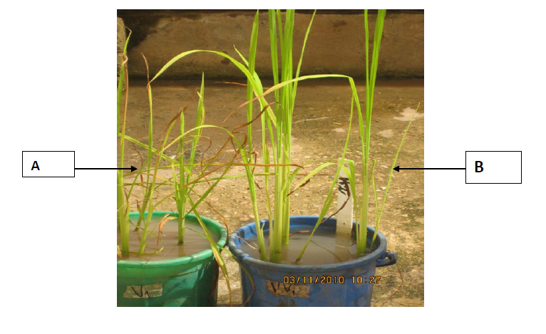 Figure 10: Symptômes de chlorose foliaire et de rabougrissement sur la variété IR64