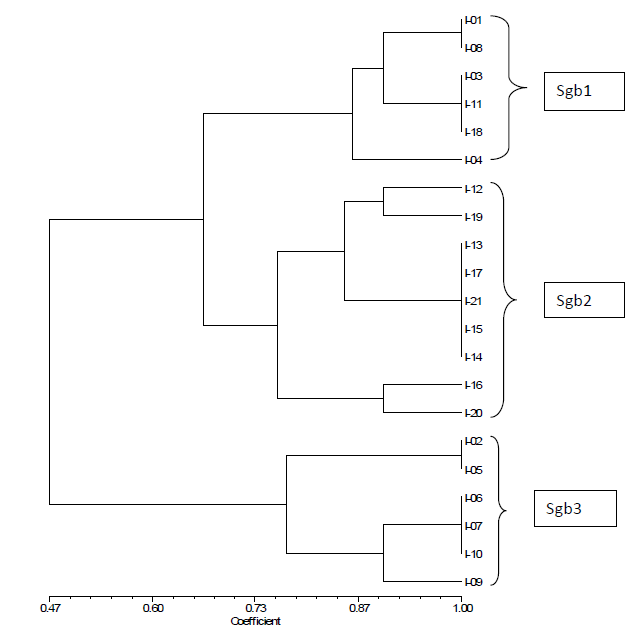 • Le troisième groupe Sgb3 regroupe les isolats (I-02, I-05, I-06, I-07, I-10,) provenant des localités de Lokossa, Calavi, Dangbo et I-09 un isolat du Niger qui a été inséré parmi les isolats utilisés.
