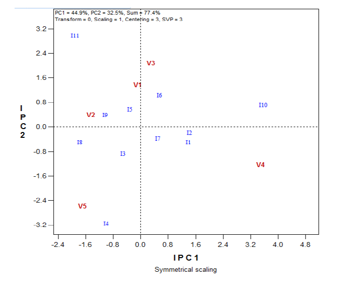 3-1-2-3 Etude des interactions génotypes x isolats en utilisant le modèle AMMI