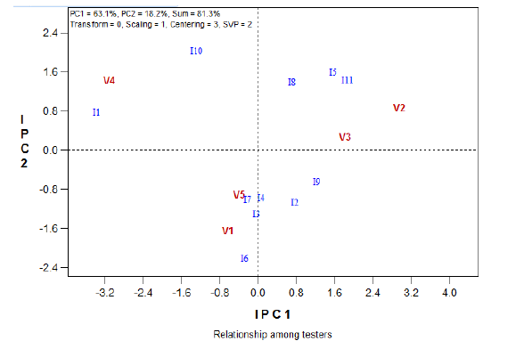 Figure 7 : Effet de l’interaction génotypes (variétés ) x environnement (isolats) sur la hauteur des variétés, selon le modèle AMMI technique d’inoculation par points de piqûre