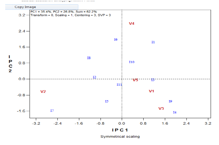 Figure 5: Effet de l’interaction génotypes (variétés) x environnement (isolats) sur la hauteur des variétés, selon le modèle AMMI technique d’inoculation au coton
