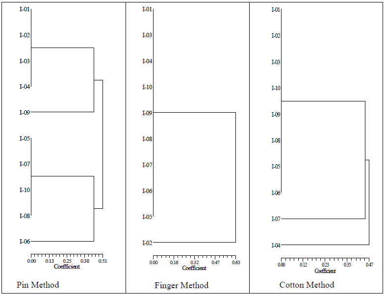 Pour la technique par frottement manuel, à l’exception de I02, qui constitue un groupe à part, tous les autres isolats constituent un même groupe et sont semblables du point de vue pathogénique.