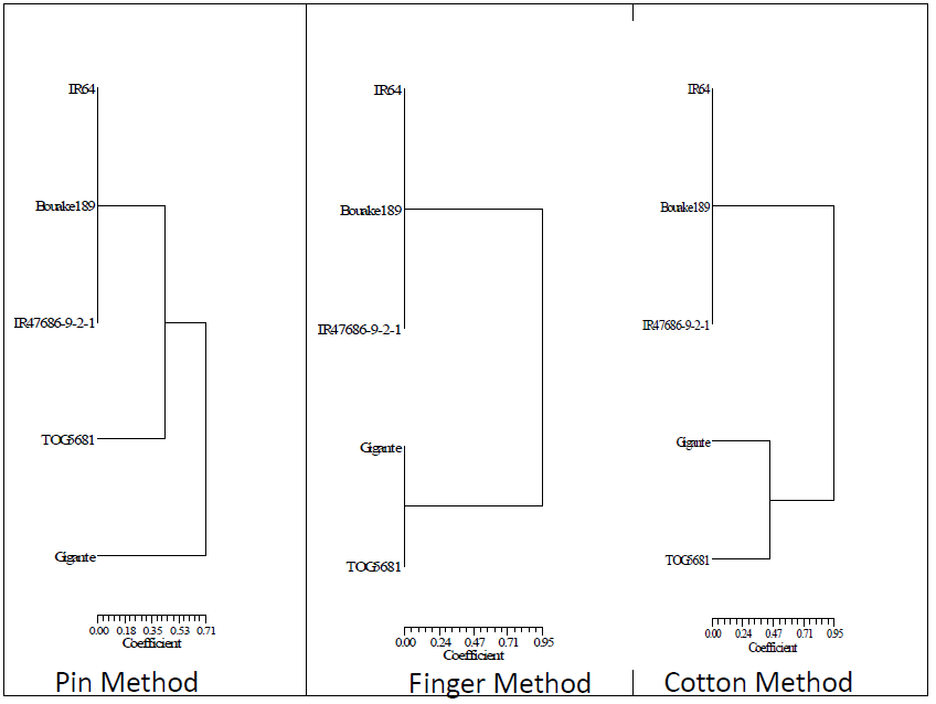 Figure 8 : Dendrogramme montrant les différents pathotypes par technique d’inoculation en utilisant le modèle AMMI (additive main effects and multiplicate interaction