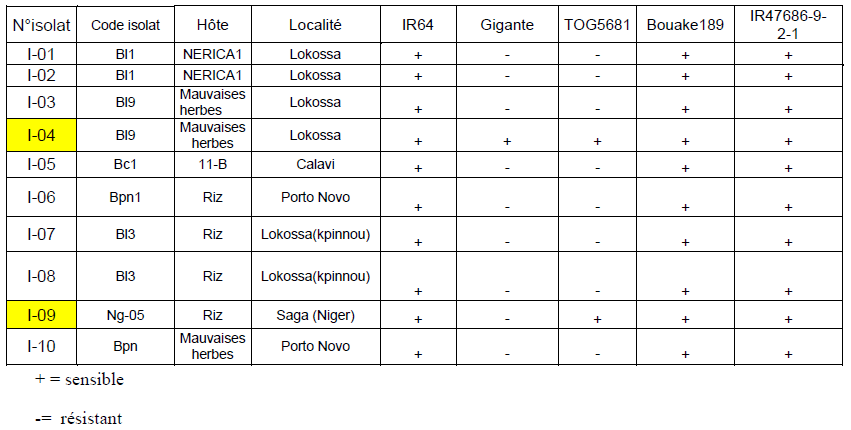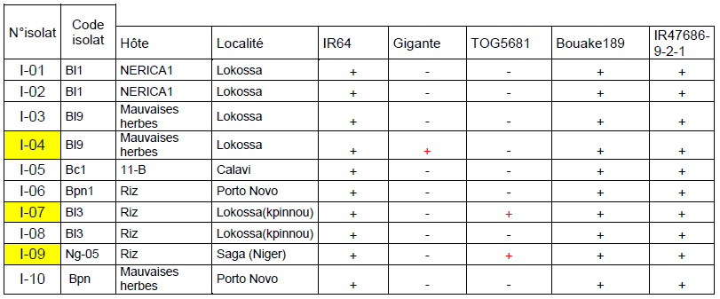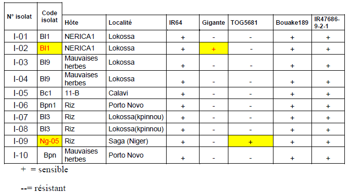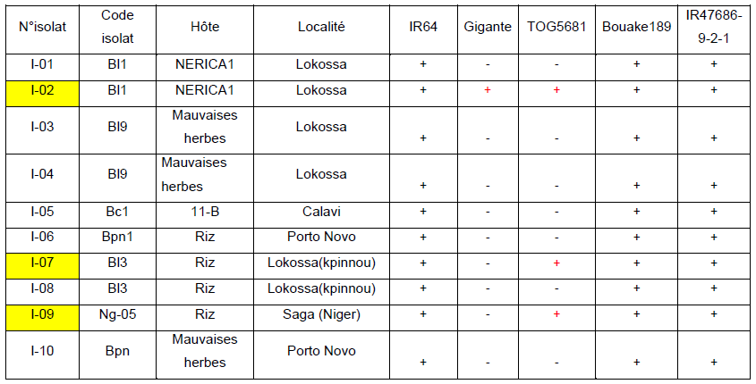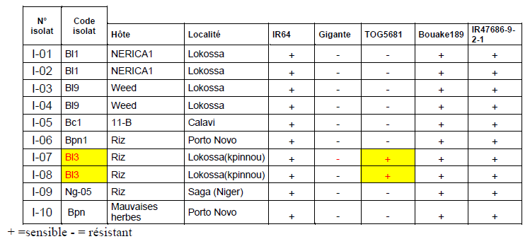 Les variétés IR64, Bouaké 189 et IR47686-9-2-1 sont les plus sensibles. Les symptômes s’apparaissent sur Tog et Gigante, mais n’atteignent pas un seuil élevé, sauf dans quelques cas.