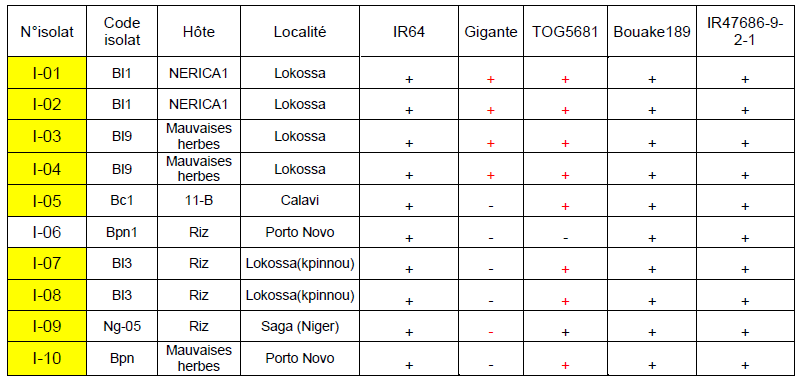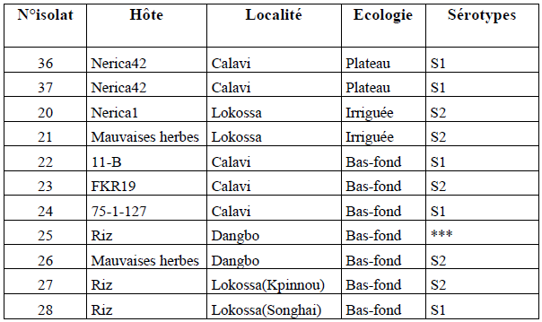 Au Bénin, les résultats obtenus par Bancolé (2006) ont révélé une forte diversité sérologique au Nord du Bénin. Trois groupes sérologiques ont été identifiés avec les isolats utilisés. Bsg-1et Bsg-2 constitués d’isolats provenant des localités de Djougou, Malanville, Tanguiéta retrouvés aussi bien sur le riz que sur les hôtes alternatifs. Par ailleurs, nos résultats n’indiquent pas l’appartenance d’isolats d’un même groupe sérologique à la même localité, ce qui est en contradiction avec les travaux de Traoré (2006) selon lesquels la distribution géographique des isolats met en évidence une relation possible entre variation écologique et origine écologique des isolats.