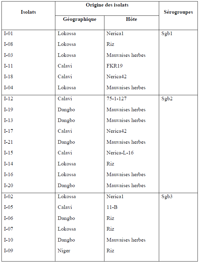 • Le premier groupe sérologique Sgb1 comprend les isolats (I-01, I-08, I-03, I-11, I-18, I-04) provenant des localités de Lokossa et de Calavi et des hôtes tels qu’Oryza sp et les mauvaises herbes.