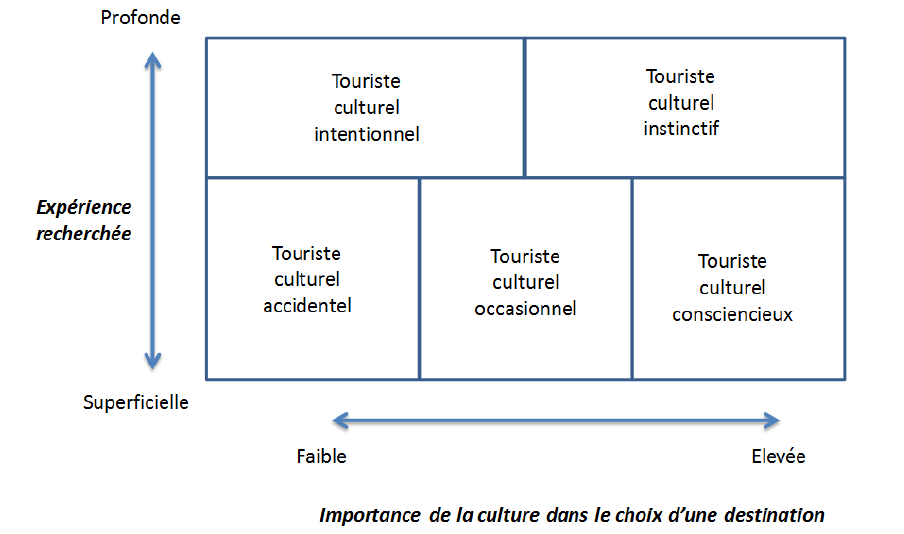 Deux auteurs, McKercher and Hilary du Cros (2002)25, ont proposé une classification des touristes culturels, interrogeant leurs identités et leurs expériences. L’expérience touristique est plus ou moins intense selon d’une part, les motifs du touriste et d’autre part, son degré de participation. Les auteurs ont donc établi cinq profils :
