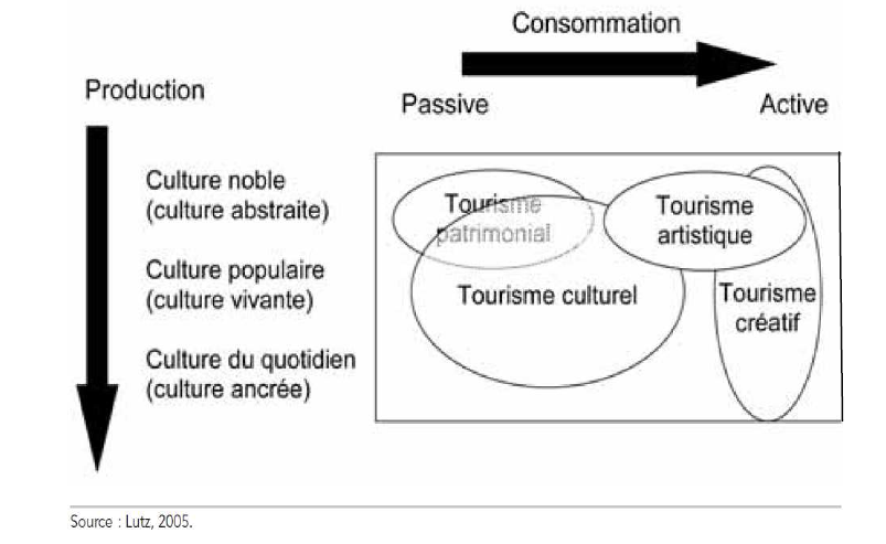 « [la] production peut être catégorisée selon différents niveaux et selon différentes époques et si sa consommation prend des formes diverses, le touriste culturel devient alors lui-même un personnage changeant et disparate, affublé d’une personnalité multiple qui varie selon les lieux où il se trouve (musée, bâtiment historique, théâtre, opéra, festival de rue, restaurant gastronomique, etc.), ses modes de consommation (participatif, contemplatif, éducatif, festif, etc.), mais aussi l’espace temporel (passé, présent et futur) et les objets (artefacts/produits, processus, expériences) sur lesquels son attention se fixe »(28)