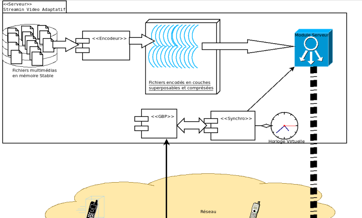 Encodeur : Ce module est chargé de récupérer les fichiers vidéo en mémoire stable et de les encoder en couches superposables. Ceci afin de permettre à notre serveur de streaming de pouvoir assurer la diffusion des couches en fonction des conditions réseaux.