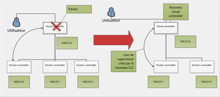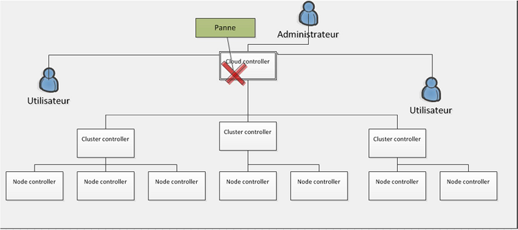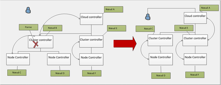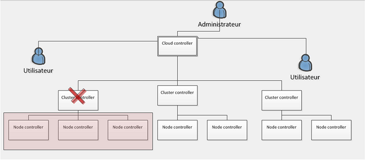 Figure 4.2: Schéma de l’architecture du cloud privé : cas de panne d’un cluster controller.