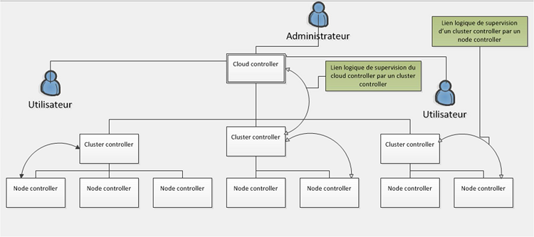 Sur la figure 4.3 de la solution proposée, un lien logique de supervision est créé respectivement entre chaque cluster controller et un contrôleur de nœud de ce cluster, et entre un cluster controller et le cloud controller. De cette manière, une panne localisée au niveau d’un cluster controller ferait automatiquement changer d’état au node controller en charge de sa supervision pour l’état de cluster controller. De même, lorsque le cloud controller tomberait en panne, le cluster controller en charge de sa supervision prendrait automatiquement sa place par changement d’état. Ce processus enclencherait immédiatement l’élection d’un nouveau cluster controller pour la supervision du nouveau cloud controller et l’élection d’un nouveau node controller pour la supervision du nouveau cluster controller.