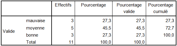 Ce résultat indique bien que si nous faisons un regroupement, les détracteurs (certainement, peut-être pas et peut-être bien) qui sont ceux qui font un bouche à oreille négatif représentent 54,5% des clients, les passifs (certainement) qui sont ceux qui ne feront rien représentent 27,3% et les promoteurs (parfaitement certains) qui sont ceux qui font un bouche à oreille positif représentent seulement 18,2%.