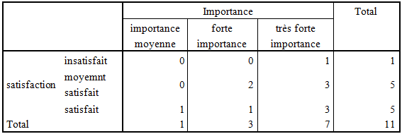 Ce tableau montre bien à la quatrième colonne, deuxième et troisième ligne que 6 clients sur 11 accordent une très forte importance aux dimensions ou caractéristiques du service mais en sont moyennement ou tout simplement satisfaits. Puis une interprétation des différents totaux nous indique comme dans les différents tableaux de tri à plat de la satisfaction (tableau VII) et de l’importance (tableau VIII) présentés plus haut, un total de 1 client insatisfait, 5 clients moyennement satisfaits et tout simplement satisfaits ; 1 client accorde une importance moyenne aux dimensions du service, 3 y accordent une forte importance et enfin 7 clients accordent une très forte importance.