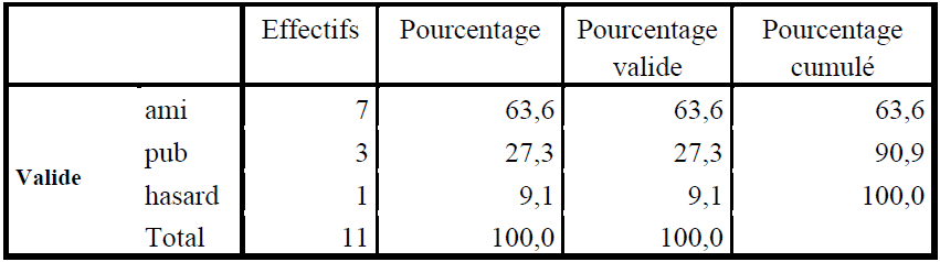 La lecture de ce tableau (précisément la quatrième colonne), nous montre bien que 63,6% de clients ont découvert l’entreprise à travers des amis et 9.1% par hasard. Ces résultats nous montrent bien que le bouche à oreille a un réel impact sur l’activité de l’entreprise.