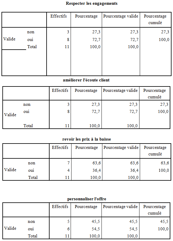 Nous présenterons ici les différents tableaux obtenus avec le tri à plat et les tableaux obtenus pour réaliser la matrice satisfaction/importance.