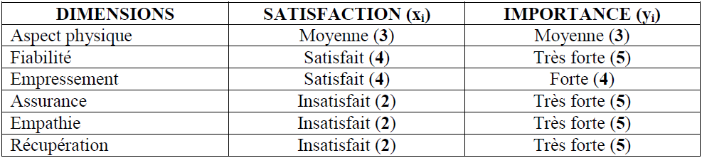 Pour ressortir ce tableau récapitulatif, nous avons regardé à chaque fois sur le graphique de la satisfaction ainsi que celui de l’importance et avons retenu le poids (différents éléments de l’échelle) le plus élevé c’est ce dernier que nous avons retenu pour chacune des caractéristiques ou dimensions du service. Nous précisons ici que les chiffres entre parenthèses représentent les poids attribués à chaque élément de l’échelle sur notre questionnaire. Ainsi, la première colonne nous indique les différentes dimensions, la seconde présente les différents poids de satisfaction que les clients accordent aux différentes dimensions et enfin la troisième présente aussi les poids mais cette fois, accordés à l’importance des dimensions par les clients. Afin de déterminer le degré de liaison entre nos variables (satisfaction/importance), nous avons calculé le coefficient de corrélation noté) « r »