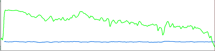 Représentation spectrale de l’intensité en vert, et l’affrontement des plis vocaux en bleu d’une voix pathologique (paralysie récurrentielle).