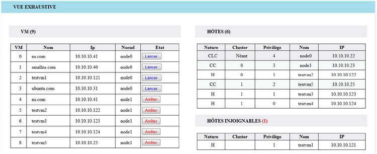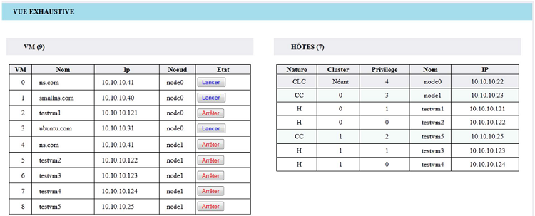 Une autre possibilité pour la disponibilité des services au niveau du système consiste à employer un serveur physique pour l’hébergement de l’application Web. Dans ce cas, seules les informations telles que l’adresse IP et le port d’écoute de ce serveur seront répliquées sur le nouveau CC élu de façon à permettre à ce dernier la possibilité de lui renvoyer les informations du réseau dès sa reprise des services du CLC. La commande define ns host paramspermet de renseigner les paramètres de ce serveur au cloud controller. Nous avons employé ce mode pour tester le fonctionnement complet de notre algorithme en utilisant 07 machines de tests dont 02 physiques et 05 virtuelles (Tableau 7.3). Ces machines ont été enregistrées comme les hôtes du système indépendamment de leur nature physique ou virtuelle. L’hôte node0 est employé comme le CLC du réseau. Nous avons ensuite enregistré les machines node1 et testvm5 comme les deux CCs du réseau. Les nœuds testvm1 et testvm2 sont enregistrés comme les NCs du cluster 0 et les nœuds testvm3 et testvm4 comme les NCs du cluster 1. La figure 7.14 montre ces différentes machines sur la plateforme Web avec leurs valeurs respectives de privilège. Lorsque nous avons arrêté la machine testvm1 élue par le CC0 (node1) (Figure 7.15), l’hôte testvm2 a été élu en recevant le privilège 1 de la part de son CC. En arrêtant le CC1 (testvm5) du second cluster, le nœud testvm3 a procédé à un changement d’état pour celui d’un cluster controller (Figure 7.16).