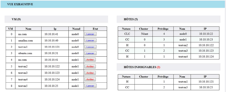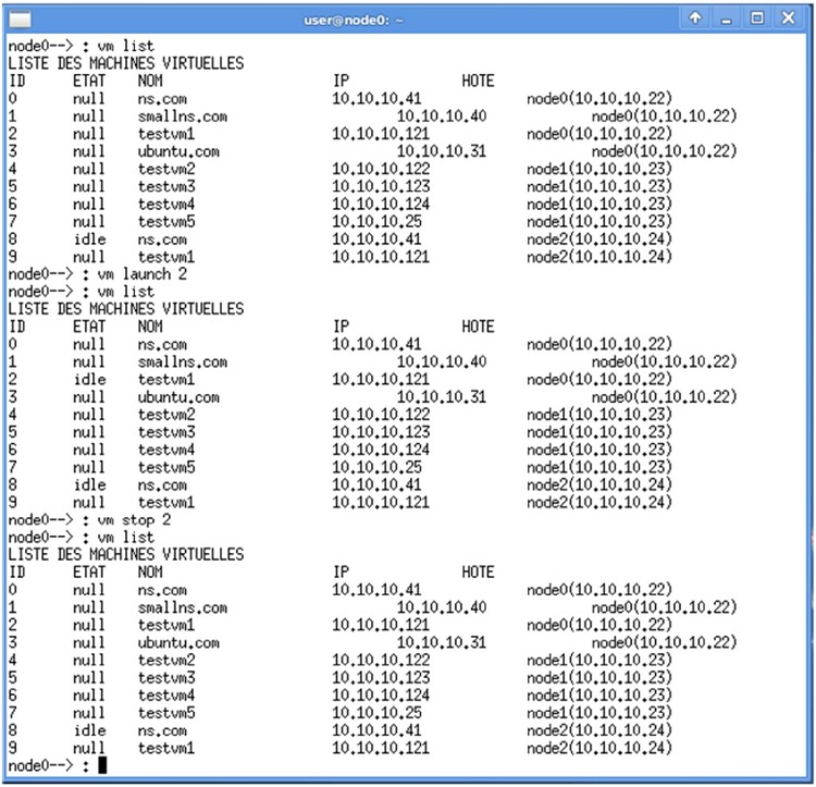 On peut observer que le nœud initial (node0) s’est octroyé le privilège 4 tandis que le premier nœud (node1) ajouté a reçu le privilège 3. Le troisième nœud du réseau (second nœud ajouté, node2) obtient le privilège 2. Il est alors possible d’administrer tout le système par l’interface CLI du nœud node0 qui permet dès lors d’obtenir la liste de tous les hôtes du réseau par la commande node list, la liste des machines virtuelles disponibles sur le réseau et sur chaque hôte par la commande vm list.