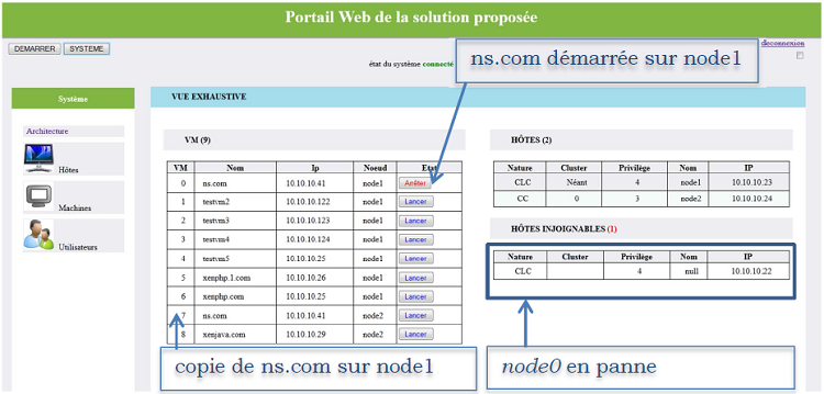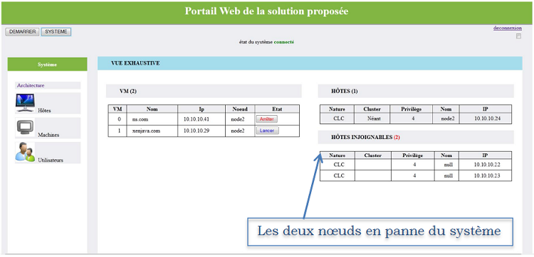 Le développement de notre système et les tests effectués ont confirmé sa capacité à assurer la continuité des services dans un environnement de cloud privé. En termes de fonctionnalités, la solution permet de gérer un ensemble de machines physiques et virtuelles à travers une interface d’administration CLI mais aussi à travers un portail Web qui offre une utilisation beaucoup plus flexible du système. La solution permet également la création des comptes utilisateurs avec la possibilité de leur affecter des machines virtuelles. Elle est compatible avec la solution de virtualisation Xen et permet le déploiement, le démarrage et l’arrêt des machines virtuelles créées.