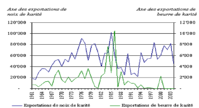 Quant aux exportations, elles suivent une tendance contraire à celle de la production. Nous en déduisons que le gros de la consommation de karité (noix, amandes, beurre) se fait localement.