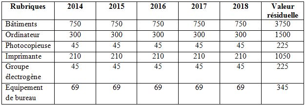 De ceci, il sied indispensable de faire d’abord un petit calcul des amortissements des immobilisations. L’amortissement correspond à une dépréciation d’un élément d’actif due à l’usage dans le temps pu au changement technique. La méthode que nous allons utiliser pour calculer les amortissements des équipements, matériels, bâtiments et mobiliers investis dans ce projet est celle de l’amortissement linéaire. C’est en effet, une méthode qui permet de repartir, d’une manière égale, les amortissements de l’investissement s’effectuera partant du principe généralement admis en matière d’amortissement en RDC (59).