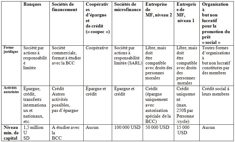 Tableau n°1 : Présentation générale du cadre légal et réglementaire des institutions financières en RDC (52)