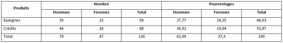 Il ressort de ce tableau ci-dessus que 58 soit 46,03% d’enquêtés dont 35 hommes soit 27,77% et 23 femmes soit 18,25% veulent sécuriser leur argent dans l’IMF ; 68 soit 53,96% d’enquêtés dont 44 hommes soit 34,91% et 24 femmes soit 19,04% manifestent l’envie de solliciter les crédits auprès de l’IMF.