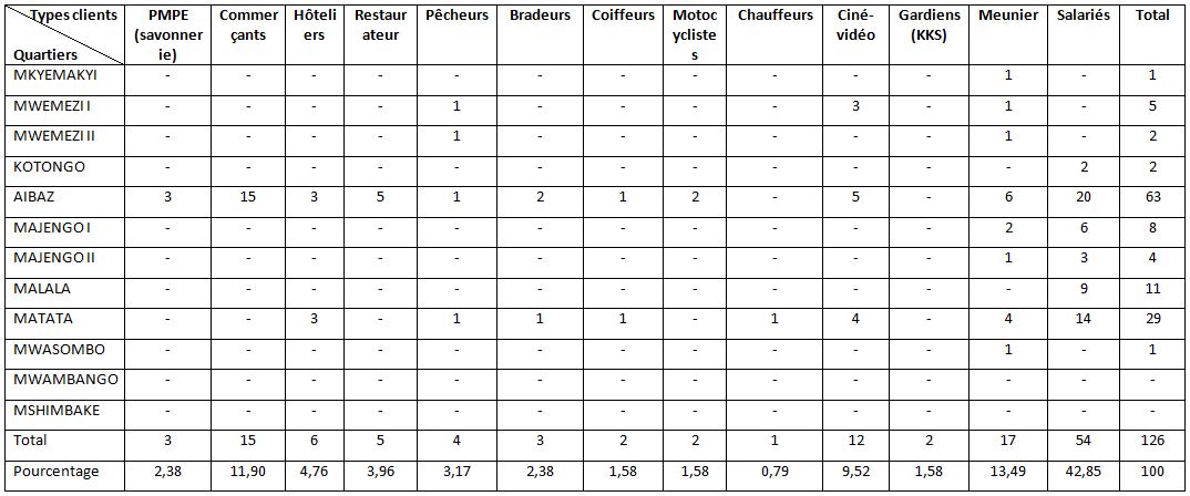 Commentaire : IL se dégage de ce tableau que parmi nos enquêtés, 3 soit 2,38% sont les PME, 15 soit 11,90% sont les petits commerçant, 6 soit 4,76% représentent les hôtels, 5 soit 3,96% représentent les restaurants, 4 soit 3,17% sont des pêcheurs, 3 soit 2,38% sont les bradeurs, 2 soit 1,58% représentent les coiffeurs et motards, 1 soit 0,79% c’est le chauffeur, 12 soit 9,52% sont les ciné-vidéos, 2 soit 1,58% sont des gardiens, 17 soit 13,49% représentent les mouliniers et 54 soit 42,85% sont les salariés.