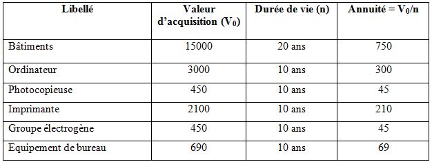 De ceci, il sied indispensable de faire d’abord un petit calcul des amortissements des immobilisations. L’amortissement correspond à une dépréciation d’un élément d’actif due à l’usage dans le temps pu au changement technique. La méthode que nous allons utiliser pour calculer les amortissements des équipements, matériels, bâtiments et mobiliers investis dans ce projet est celle de l’amortissement linéaire. C’est en effet, une méthode qui permet de repartir, d’une manière égale, les amortissements de l’investissement s’effectuera partant du principe généralement admis en matière d’amortissement en RDC (59).