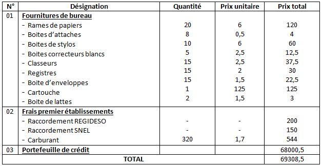 Les tableaux ci-dessous récapitulent les besoins d’investissements initiaux pour ce projet d’implantation d’une IMF à BARAKA/FIZI.