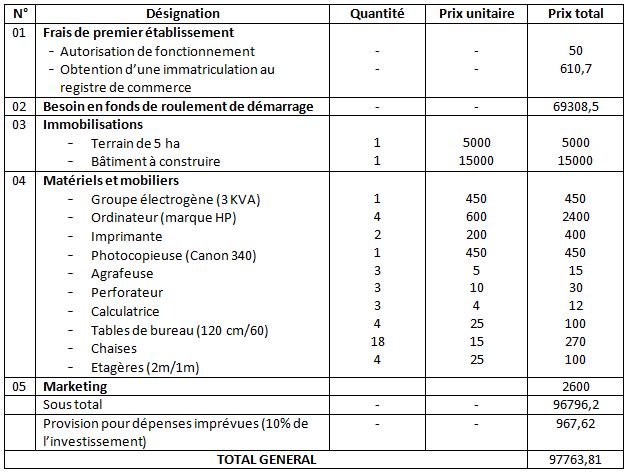 Dans le coût relatif à l’investissement, nous avons inséré tous les coûts supportés avant le démarrage du projet. Ces dépenses concernent les équipements, les matériels et mobiliers, le besoins en fonds de roulement de démarrage. Il sera important d’inclure aussi les provisions pour dépenses imprévues dans cette catégorie des dépenses.