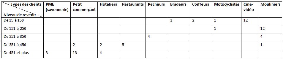 L’étude de ce tableau fait l’état des revenus réalisés par mois par les groupes des consommateurs de services bancaires à BARAKA. En effet, ce tableau nous montre que les 3PME, et 2 et 13 petits commerçants enquêtés réalisent un revenu mensuel de 451 dollars américains et plus, et 351 à 450 et 451 dollars américains et plus.
