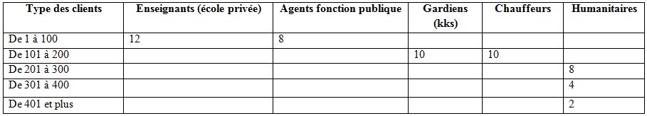Il ressort de ce tableau ci-dessus que 12 enseignants et 8 agents de la fonction publique touchent un salaire allant de 1 à 100 dollars par mois tandis que 10 gardiens et 10 chauffeurs touchent aussi un salaire de 101 à 200 dollars américains par mois. Par contre, 8, 4 et 2 humanitaires touchent un salaire qui varie de 201 dollars américains et plus.