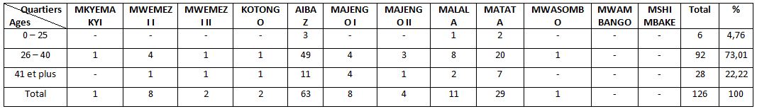 Commentaire : Il ressort, dans ce tableau que la majorité de nos enquêtés dans les différents quartiers de la cité de BARAKA se situe dans l’intervalle de l’âge de 26 et 40 ans. De ce fait, à l’issu du résultat de notre identification, 6 enquêtés soit 4,76% ont l’âge compris entre 0 et 26 ans ; 92 enquêtés, soit 73,01% ont l’âge compris entre 26 et 40 ans et enfin, 28 soit 22,22% sont de la tranche d’âge allant de 41ans et plus.