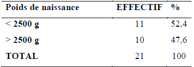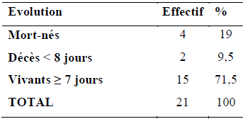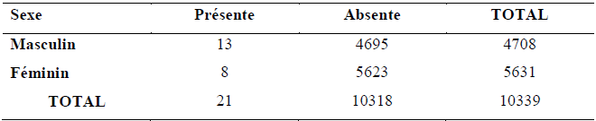 Pendant notre période d’étude, nous avons retenu 21 cas de malformations congénitales sur 10339 naissances vivantes soit un taux de prévalence de 0,2% et un total de 10323 accouchées.