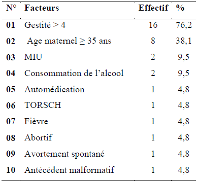 Le tableau ci-dessous montre les fréquences des facteurs de risque des malformations congénitales.