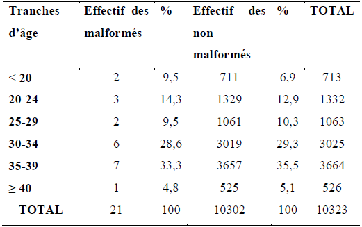 Le tableau suivant montre la survenue d’une malformation congénitale et l’âge maternel