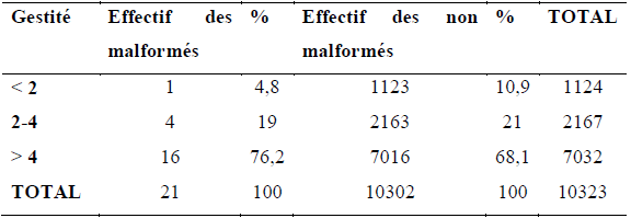 Le tableau suivant montre la survenue d’une malformation congénitale et gestité